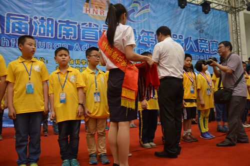 5月15—17日,第八届湖南省青少年机器人竞赛在衡阳市成章实验中学举行,绥宁县长铺二小斩获教育机器人即兴擂台赛4枚金奖。 省科技活动中心主任陈紫封给该校获奖选手颁奖 该校选手黄睿、唐哲文、朱逸澄、成诺行同学用一个个小零件拼装成机器人,再根据考场线路图,运用电脑编程,使机器人沿着指定线路行走,并完成规定报警、推物等任务。他们沉着冷静,机智应对,顽强拼搏,并以较 -
