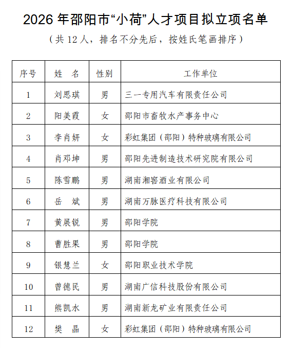 根据《关于开展2026年邵阳市“小荷”人才项目申报工作的通知》(邵市科协字〔2026〕5号)文件规定,经推荐申报、资格审查、联合初审、专家评审、评审领导小组审核批准等程序,评选出了刘思琪等12名“小荷”人才项目拟立项扶持人员,现予公示。
